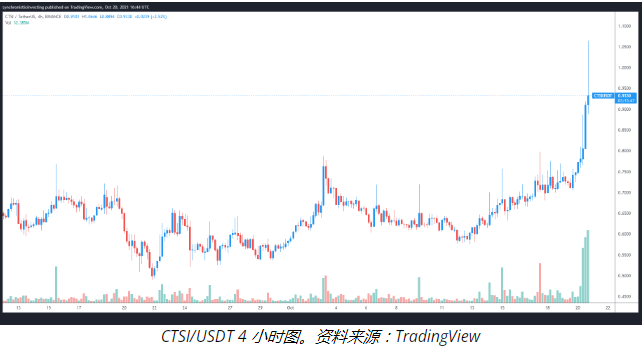 来自Cointelegraph Markets Pro和TradingView 的数据显示,CTSI 的价格已从 10 月 19 日的 0.70 美元低点上涨 51% 至盘中高点 1.07 美元,其 24 小时交易量飙升 587% 至 2.88 亿美元。