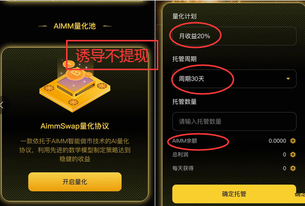 不仅如此,为了不让用户提现,还设置了一个AIMM量化池,用月收益20%诱导大家,很多人眼馋这高收益而不提现,怎么就不想想,能提出来的才是钱,不然就只是一串数字而已,这样摆明了就不想用户提现,一旦跑路倒霉的还不是这些投资者吗?