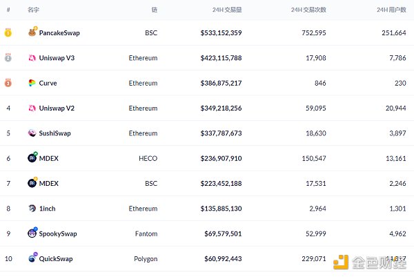 过去24小时去中心化交易所的交易量数据来源:Debank