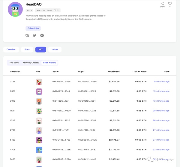 可以观察到,Doodles和HeadDAO的交易记录都是比较频繁的,是最近热度和流动性极高的新项目,7天内的流动性分别为30%和54%,近7天的市值增长也是十分的迅速,进而可以结合项目详细数据,以及参考往期文章的分析方法做进一步判断。