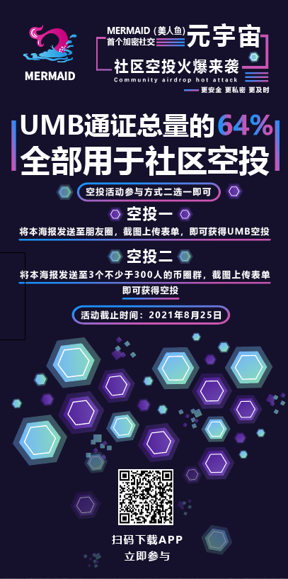 本次空投活动参与无门槛,人人都可以拿到UMB的空投,只需要将 MERMAID(美人鱼)的空投活动海报和指定文案转发至微信朋友圈或者转发3个业内群(二选一)即可获得本次的UMB空投。
