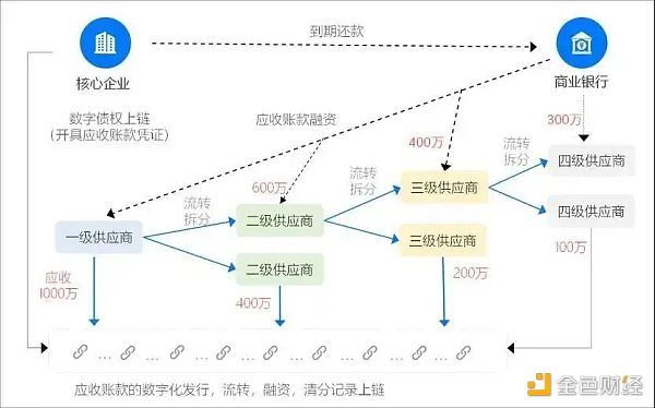 (3)融资申请:在核心企业确认的前提下,已经形成应收账款的 1 级供应商,可以向金融机构申请融资,或者将已确权的应收账款拆分给 2 级供应商,由 2 级供应商来向金融机构申请。