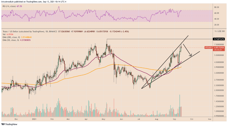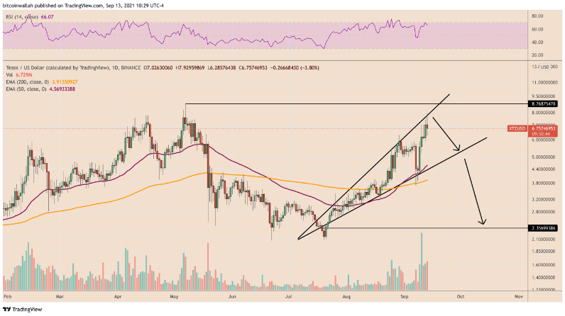 XTZ/USD 每日价格图表具有上升的扩大楔形。资料来源:TradingView.com