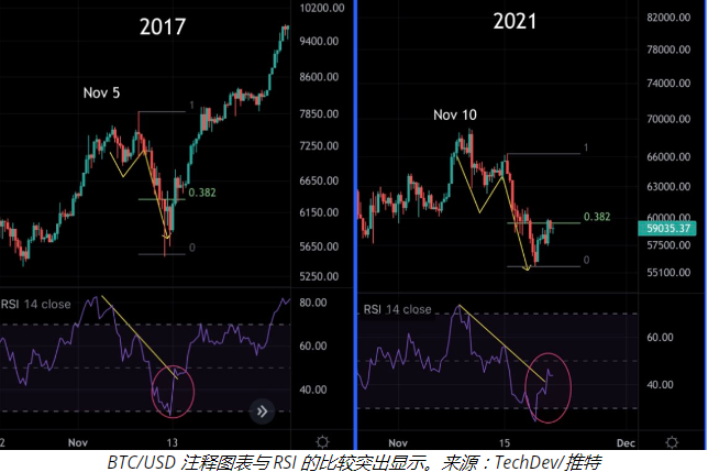一张图表进一步显示了比特币的相对强弱指数 (RSI) 如何复制粘贴其 2017 年的表现,尤其是在 11 月。