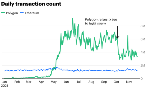 由于交易费用不到一分钱,Polygon的未来愿景看起来似乎是合理的。在激励计划的帮助下,用户纷纷涌向Polygon POS,其每日交易量超过了以太坊(尽管其中包括很多垃圾邮件交易)。