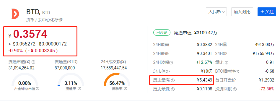 先来说说“BTD存储链”这个项目,项目是19年5月发起的,号称是全球首家区块链的分布式存储。前面宣传的风风火火,但实际上项目花了两年时间,历史最高也才只涨到了5块多人民币。