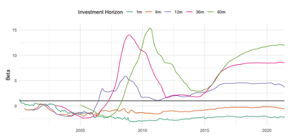 黄金回报的滚动Beta值与不同投资期限内的CPI变化