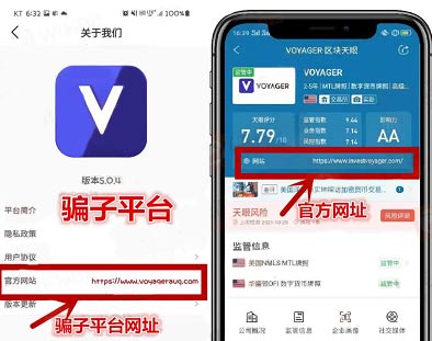骗子就是利用Voyager原有的用户的基础,特地搞出一个Voyager仿盘,骗取一些不明所以的用户投资入金。却也被一些火眼金睛的用户发现,这个是冒牌的,因为这个仿冒平台的网址和真正的Voyager平台的网址不一样。