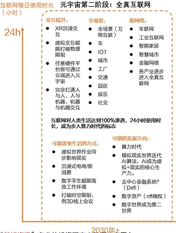 在元宇宙的第二阶段,它可能是一个始终在线且实时渲染的3D互联网(虚拟世界),将现实和虚拟连接在一起。那个时候互联网将对人类生活达到100%的渗透,而每日使用时长提升至24小时(全时性)。