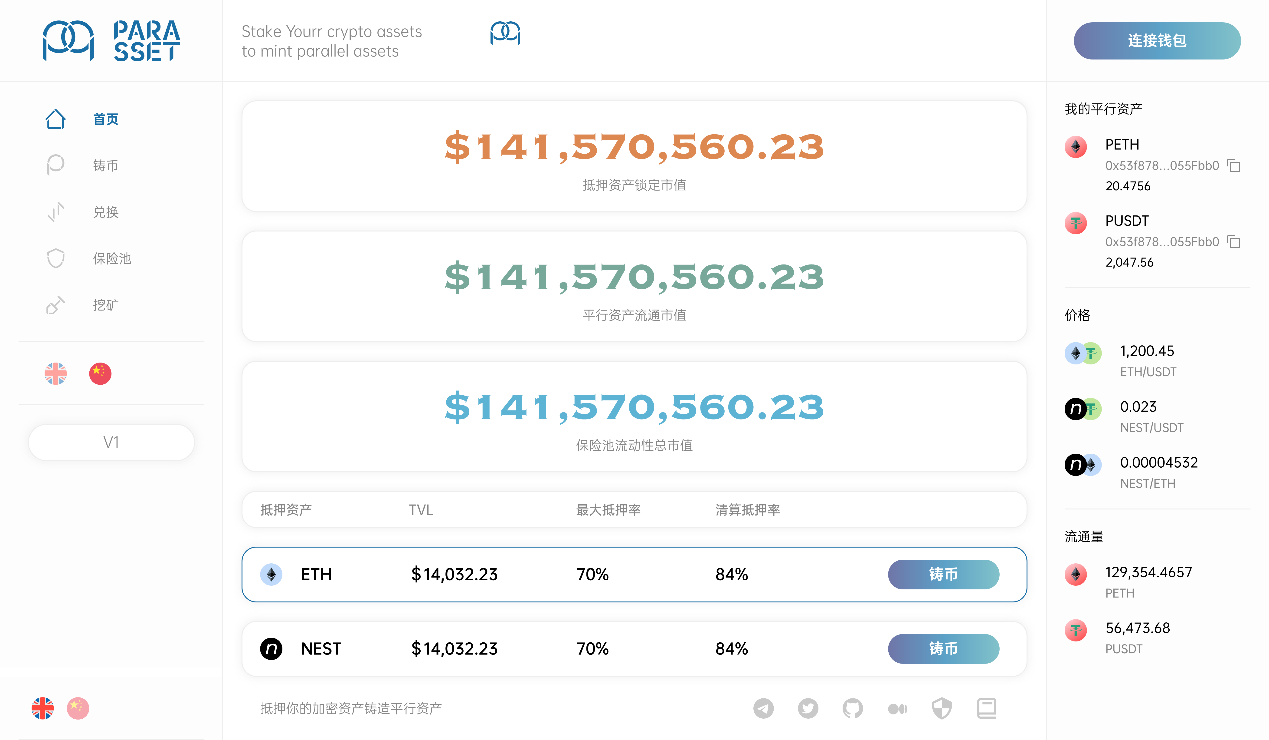 用户可以通过抵押NEST、ETH这两种标的资产在Parasset上铸造内在价值1:1锚定的p资产,例如pETH、pUSD等。